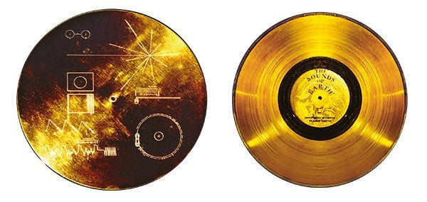 -El disco de Oro de las sondas Voyager. En su exterior aparecen grabadas instrucciones para su uso, así como algunos símbolos anteriormente usados en la placa de las Pioneer que indican su procedencia-