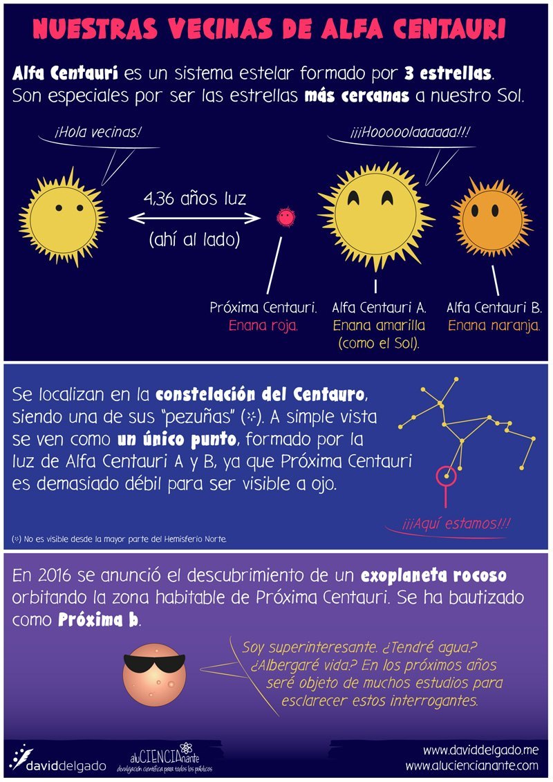 En agosto de 2016 se publicaba en Nature el descubrimiento de un exoplaneta rocoso que orbita alrededor de Próxima Centauri, bautizado como Próxima b o Próxima Centauri b. El descubrimiento del planeta fue hecho por un equipo dirigido por el astrofísico barcelonés Guillem Anglada-Escudé de la Universidad Queen Mary de Londres, en base a datos obtenidos por telescopios del Observatorio Europeo Austral situados en Chile (recordemos que Alfa Centauri no es visible desde Europa).