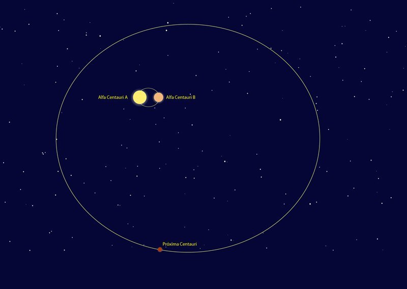 Tenemos un sistema de tres estrellas con una posición un tanto peculiar: los dos miembros más grandes (Alfa Centauri A y B) giran entre sí, orbitando en torno a un centro de gravedad común, en un periodo de 80 años. La distancia entre ambas varía de 11,2 UA (aproximadamente la distancia del Sol a Saturno) a 35,6 UA (aproximadamente la distancia del Sol a Plutón). Por su parte, Próxima Centauri orbita en torno a las dos grandes a una distancia mucho mayor: entre 4.300 y 13.000 UA. La duración de esta órbita elíptica de Próxima Centauri alrededor del dúo formado por Alfa Centauri A y B se estima en unos 550.000 años. Curiosamente, se encuentra en la actualidad en el punto cuya distancia a nuestro Sistema Solar es mínima, por lo que de las tres estrellas, es Próxima Centauri la más cercana: mientras Alfa Centauri A y B están a 4,36 años luz, Próxima Centauri actualmente se encuentra a una distancia de 4,23 años luz. De ahí su nombre.